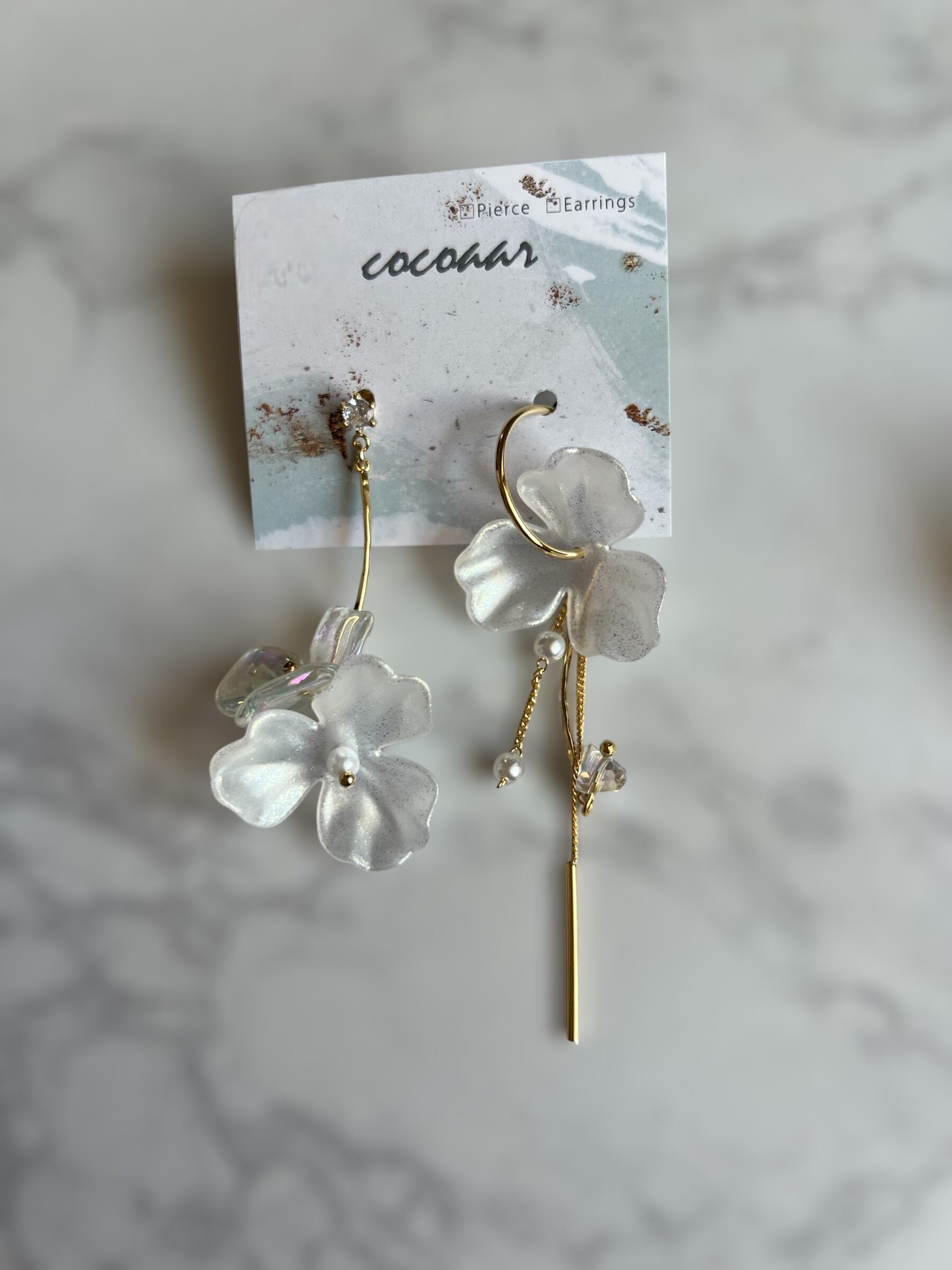 アシンメトリーやフラワーデザインがおしゃれな、ゴールドのピアスが登場しました!韓国から直輸入した、素材で作った華やかなアクセサリーは、どんなコーディネートにもぴったり♪アシンメトリーデザインが個性的で、一気におしゃれ度をアップしてくれます。